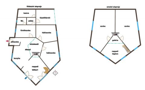141m²-es belső két szintes,különleges ötszögletű lakóház 4 szobával, konyhával, fürdőszobával, kamrával, télikert-nappalival és terasszal. A ház fűtése fatüzelésű kemencével és légfűtéssel biztosítja a meleget. A télikertből csodálatos kilátás nyílik a környező dombokra és völgyekre.